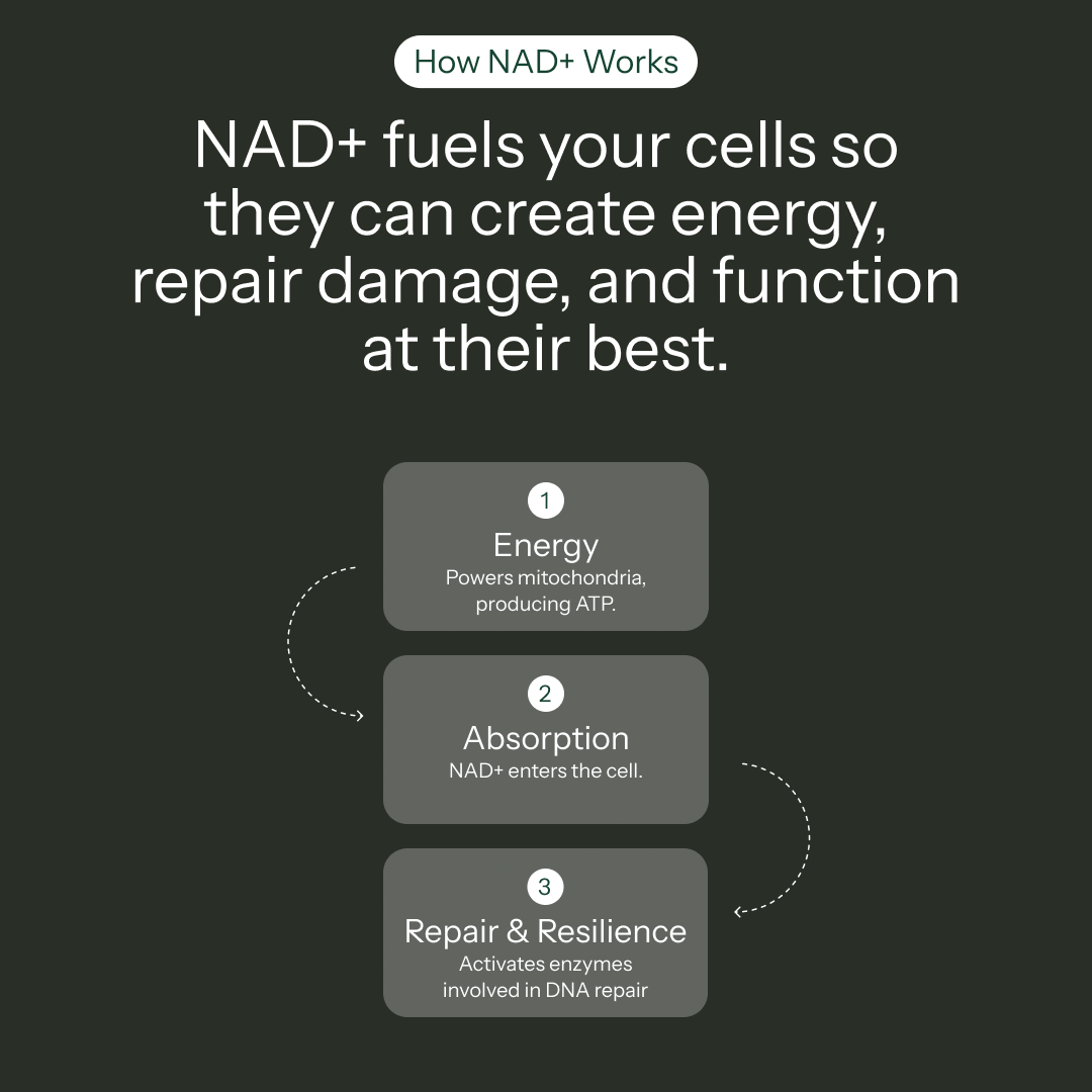 NAD+ is crucial for mitochondrial function, driving ATP production to fuel energy for all cellular activities. Improving energy at the cellular level improves how we feel too.